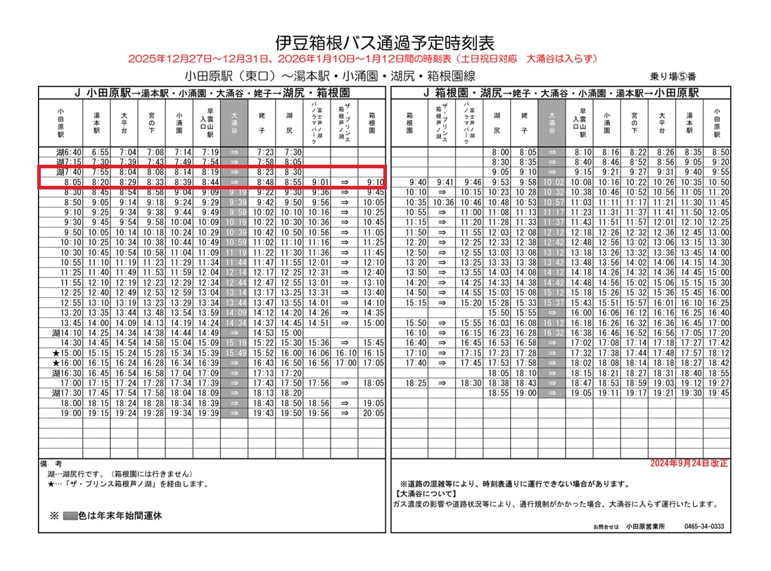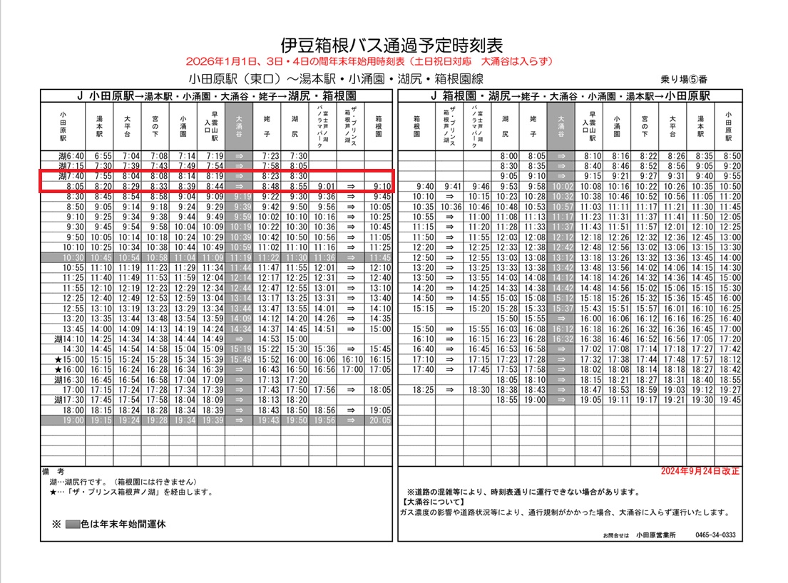 午前中にご利用をお考えの方や、特に【一日湯治】のご利用の方は、大変なご不便ではございますが【大涌谷】開園前に通過する以下の赤枠のバスにお乗りいただく事をおすすめ致します。