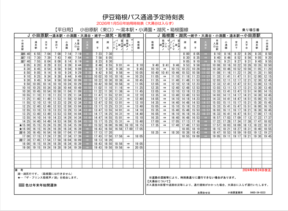 これ以降のバスにつきましては、時間が経つにつれ徐々に渋滞が始まり、到着時間が遅れていく事が予想されます。午後からご利用をお考えの方は、伊豆箱根バス(Jライン)以外の交通機関のご利用もおすすめいたします。